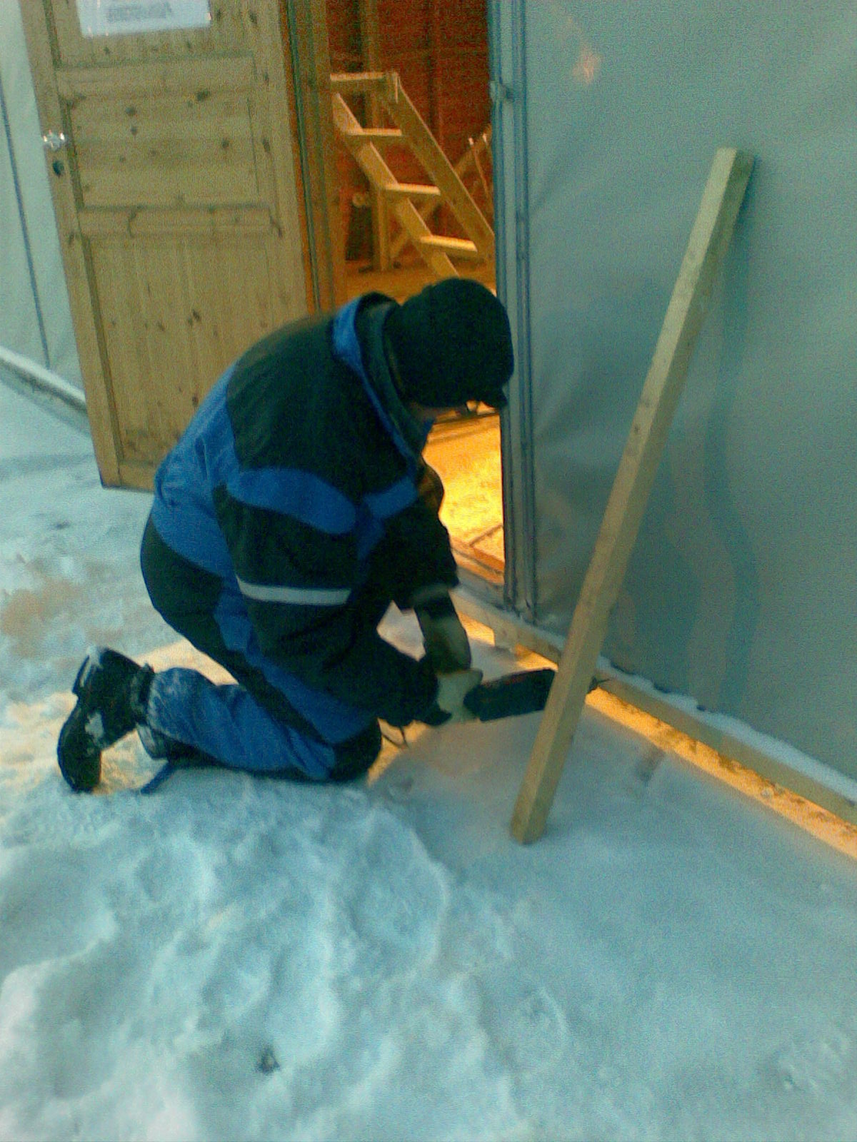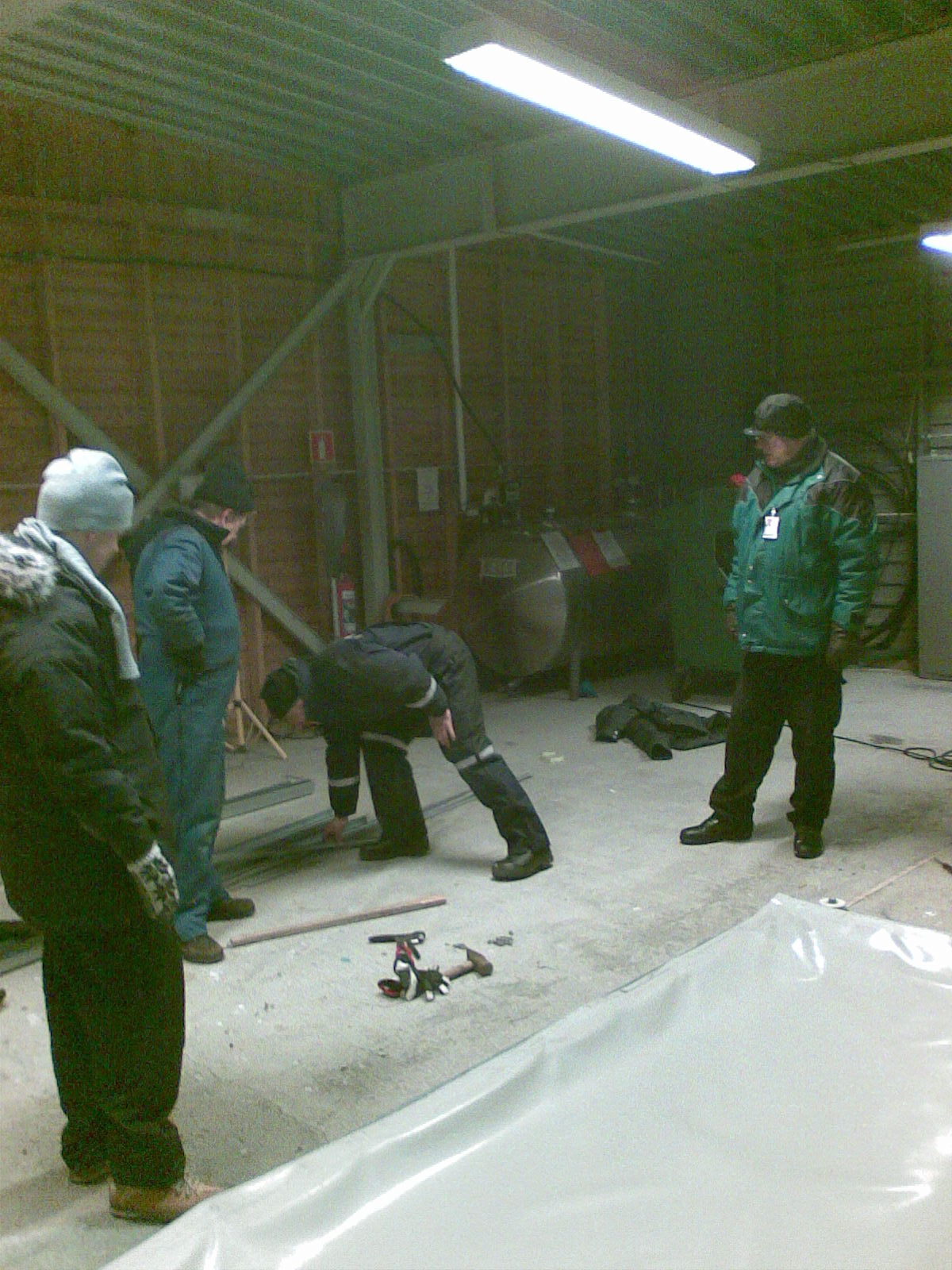 5 av oss møtt opp for å reparere hangar porten torsdagskveld (bilde 1). Vi var meg selv (Ed), formann Leif, hangarsjef Tom Roald, Airbus-aspirant Martin og, som meget nyttig innleid arbeider, Martins far, Bjørn. Bjørn fortjener en stor takk fra klubben! Det var kaldt og blåsig. Arbeidet tok hele kvelden, men vi fikk porten på plass. Leif og jeg gjorde det avsluttende arbeidet fredags morgen (blide 2). (skribent og bildeknipser: Ed)