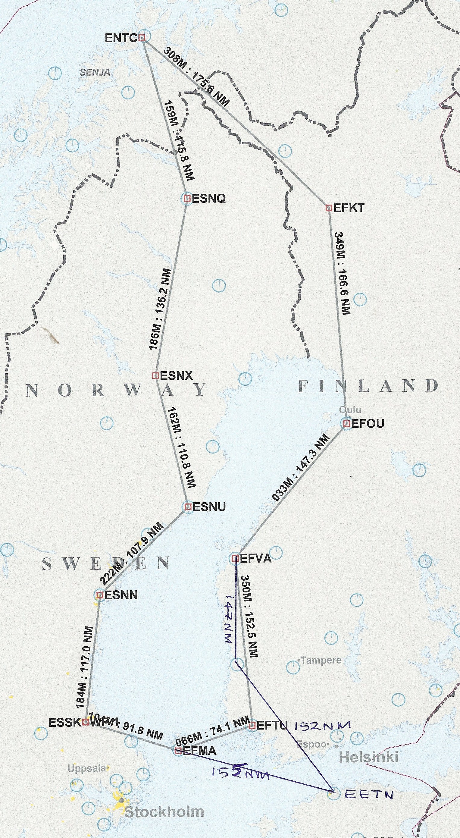 A) Går sørover igjennom Sverige til Mariehamn, evt. videre til Tallinn, med retur opp igjennom Finland.
